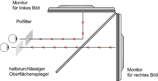 Similar to the Camera Mirror Rig (see Technology - Shooting), a semi-transparent mirror and two normal computer monitors can be used to arranged a 3D viewing device. In appreciation to the Dutch 3D pioneer Co van Ekeren, this vision device is also called Cobox. For image separating the already existing polarization of the monitors is used, so that except the polarization glasses no further optical elements are necessary.